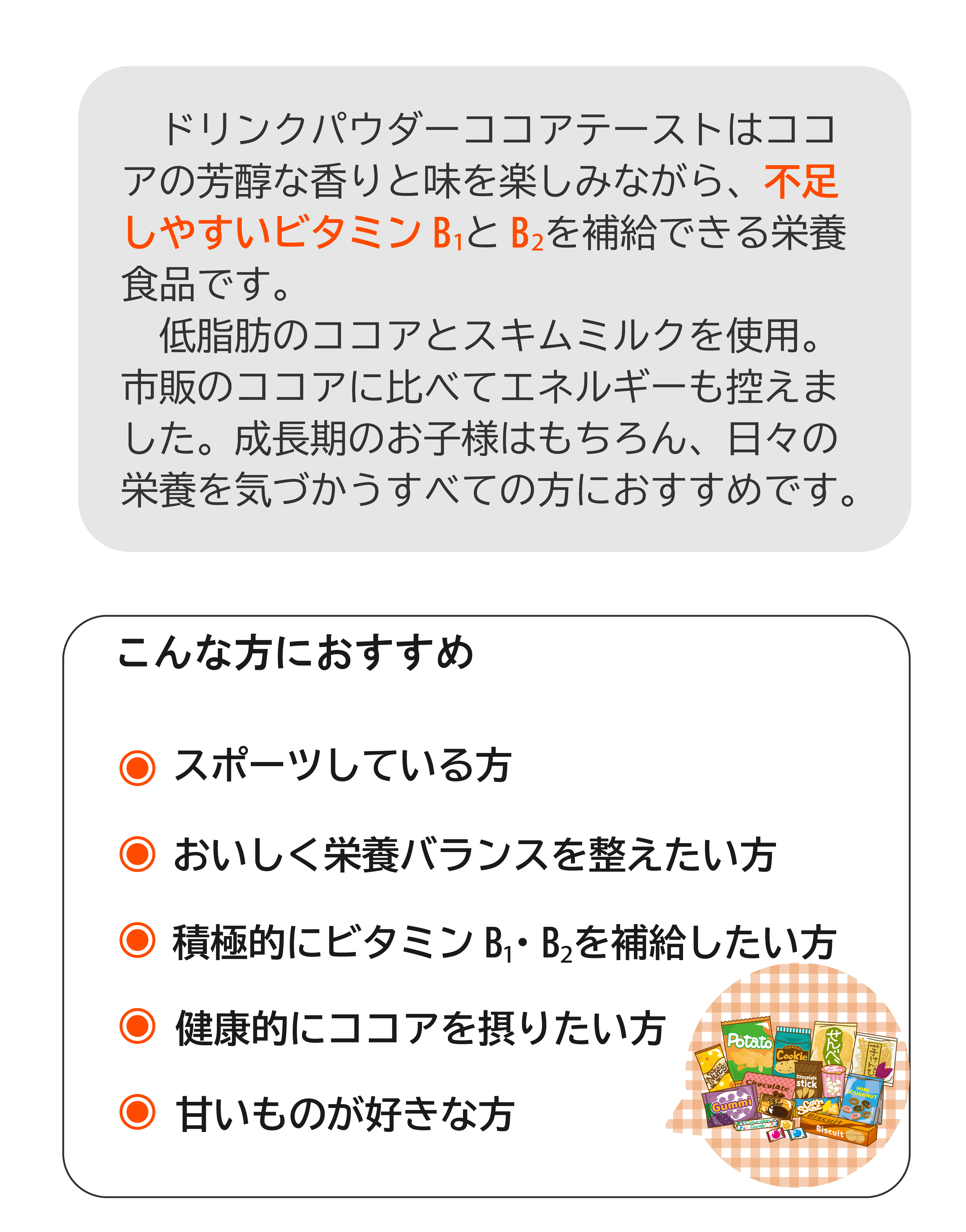 ドリンクパウダーココアテーストは、低脂肪のココアを使用した、水やお湯に溶けやすい粉末清涼飲料です。