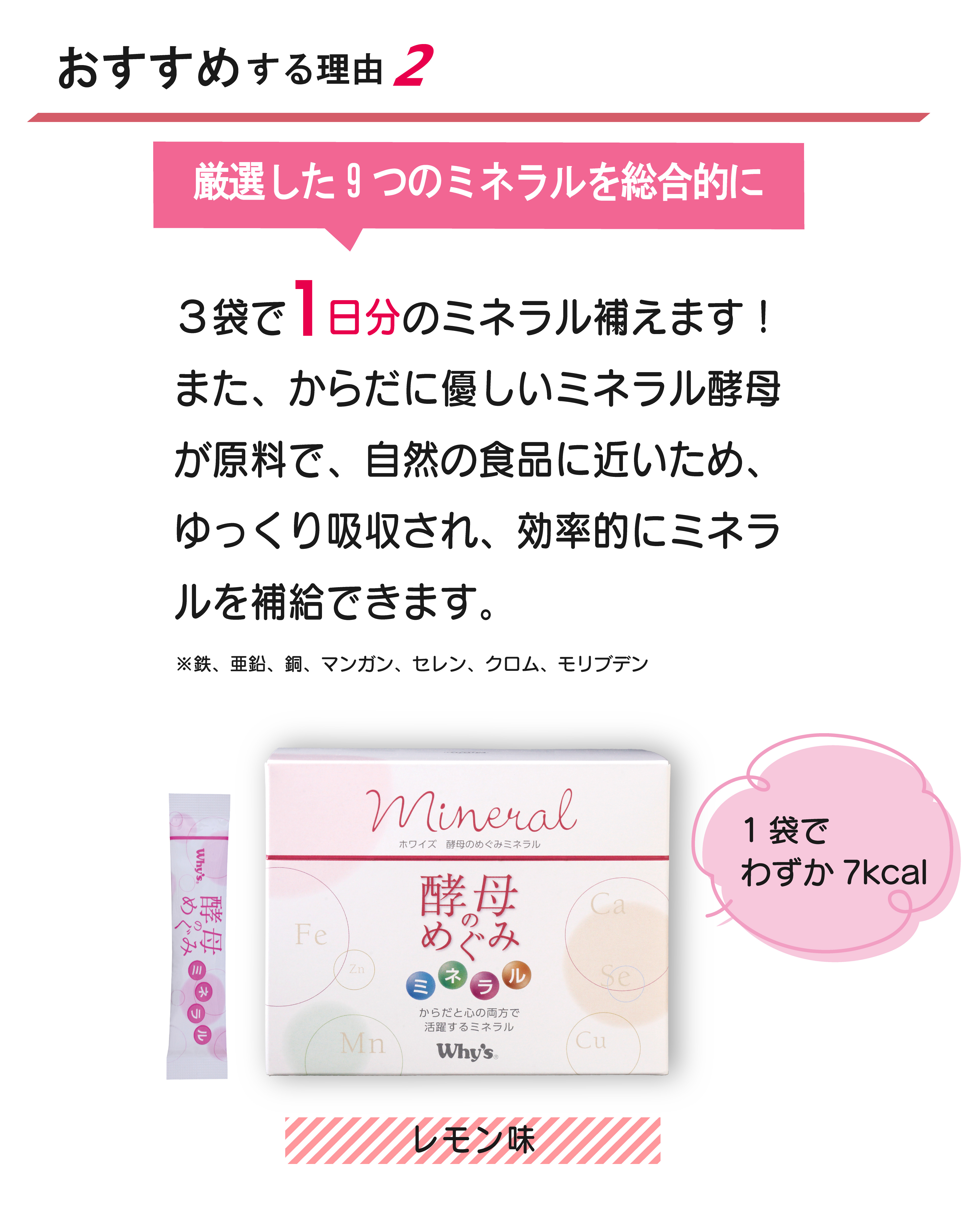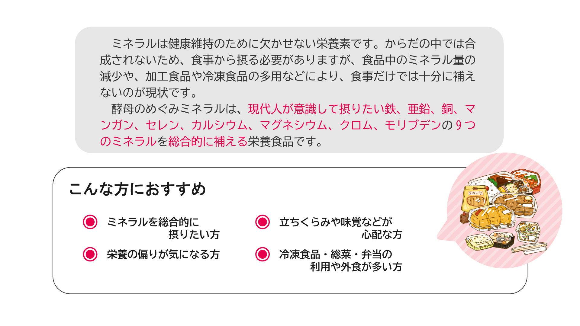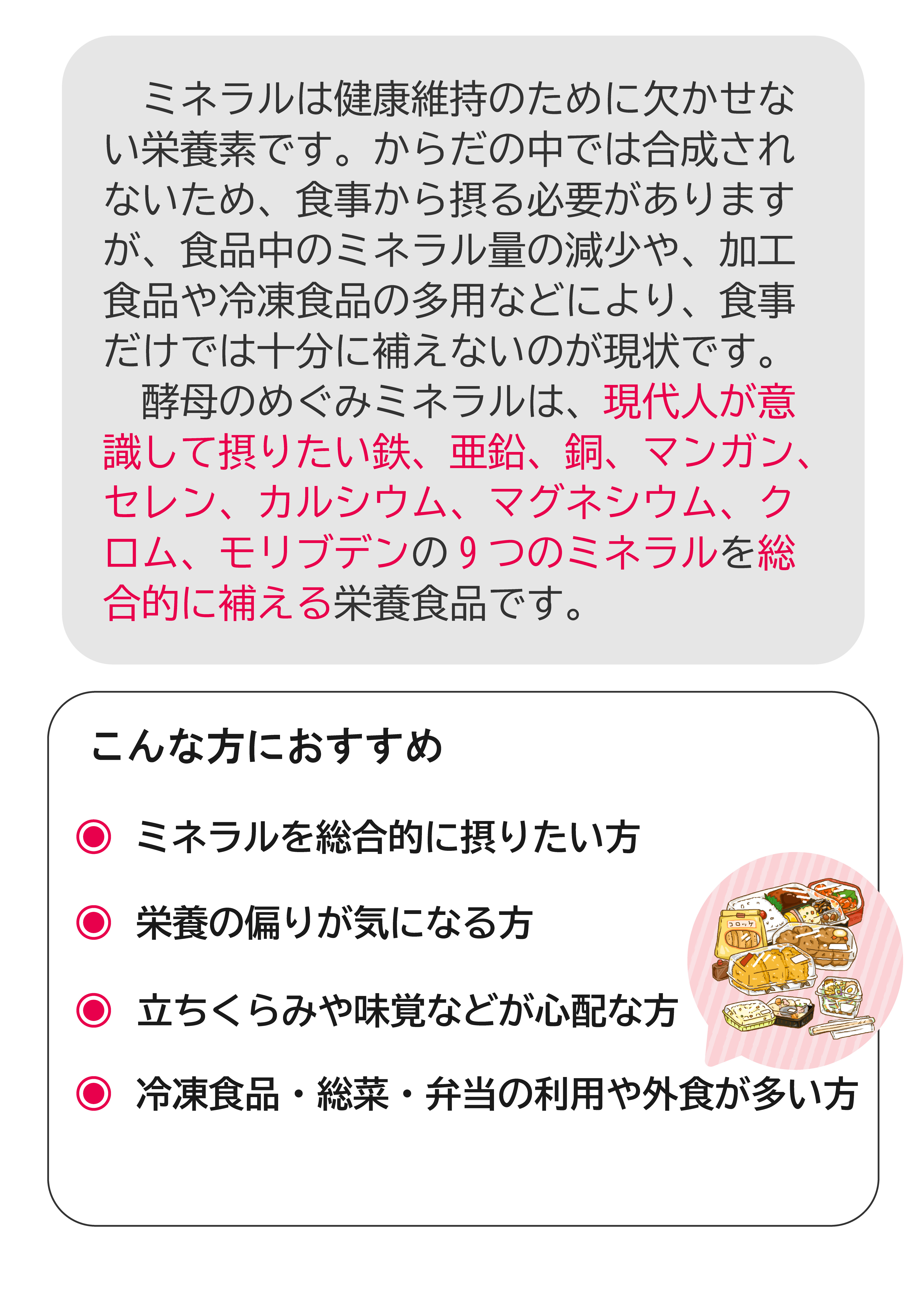 酵母のめぐみミネラルはミネラルをバランスよく、総合的に補える栄養食品です。