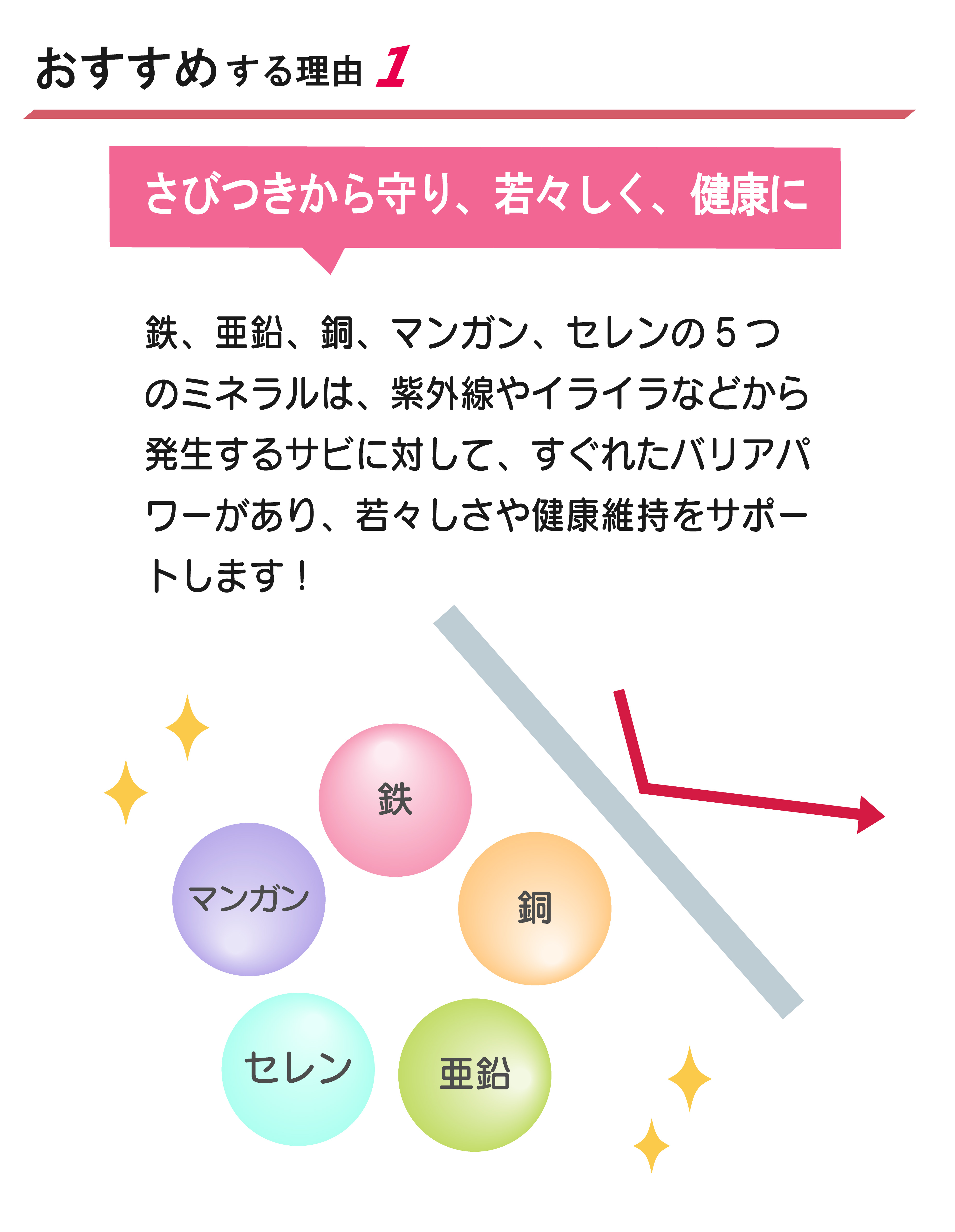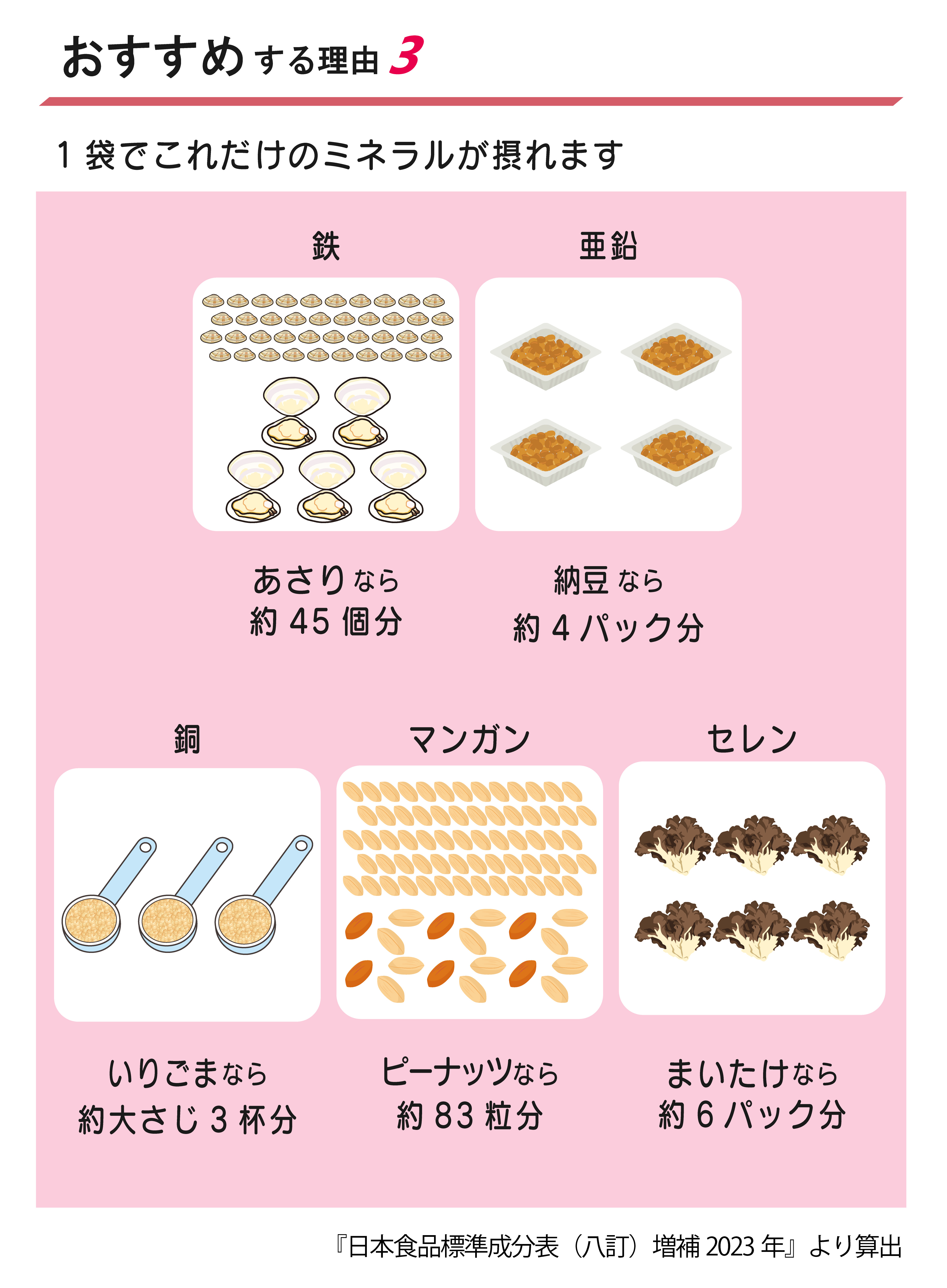ミネラルは代謝に関わったり、構成成分になるなど、からだの機能を正常に保つ重要な働きがあります。